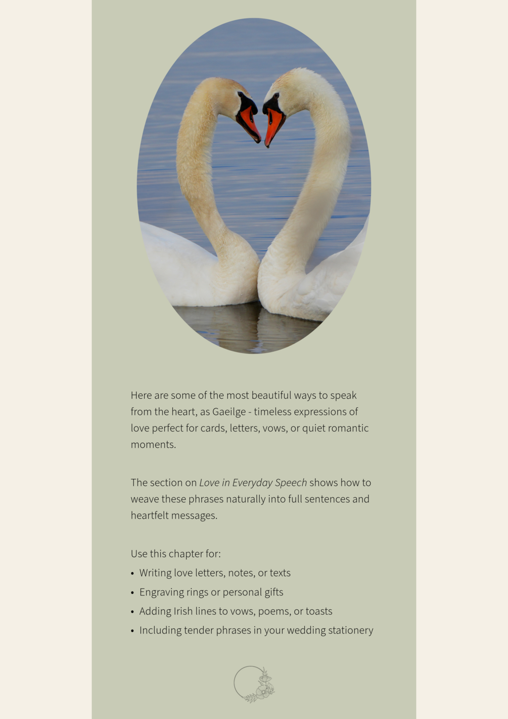 Created by a native Irish speaker from the Connemara Gaeltacht, this ebook is filled with authentic, heartfelt Irish words, phrases, blessings, vows and romantic expressions designed to add warmth, heritage, and meaning to your special day. Whether you're planning a fully bilingual ceremony or simply want to add a touch of Irish charm, this guide makes it easy. Every phrase includes phonetic pronunciation and English translation so you can use Gaeilge confidently, even if you’re a complete beginner.